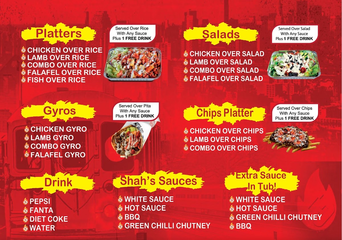 Overall, the menu at Shah’s Halal Food Greenford keeps things simple yet satisfying, focusing on hearty, street-food classics. The platter selection-featuring Chicken Over Rice, Lamb Over Rice, Combo Over Rice, Falafel Over Rice, and Fish Over Rice-offers generous, filling options that cater to both meat lovers and vegetarians. The gyro range, including Chicken Gyro, Lamb Gyro, Combo Gyro, and Falafel Gyro, provides a convenient handheld alternative without sacrificing flavor. For lighter choices, the salads such as Chicken Over Salad, Lamb Over Salad, Combo Over Salad, and Falafel Over Salad maintain the same protein variety with a fresher twist. The indulgent Chicken Over Chips, Lamb Over Chips, and Combo Over Chips platters are perfect for those craving something more comforting. To complement the meals, classic drinks like Pepsi, Fanta, and Diet Coke are available, while signature condiments-Hot Sauce, Bbq, and Green Chilli Chutney-add customizable flavor. Although prices are not listed, the menu’s straightforward structure and familiar dishes make it easy to order and appealing for a quick, satisfying bite.